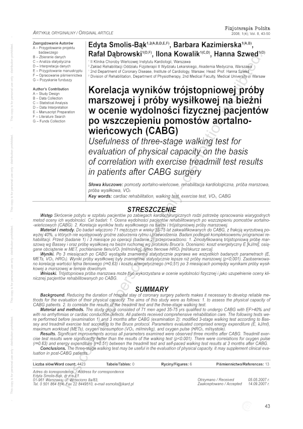 08-1-043 Korelacja wyników trójstopniowej próby marszowej i próby wysiłkowej na bieżni w ocenie wydolności fizycznej pacjentów po wszczepieniu pomostów aortalnowieńcowych (CABG) - Smolis-Bąk et al