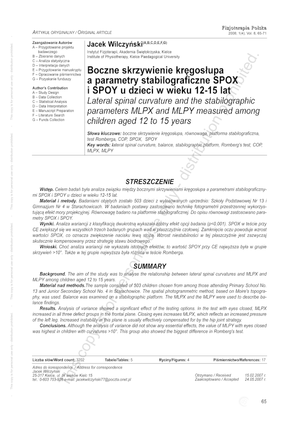 Jacek Wilczyński – Lateral spinal curvature and the stabilographic parameters MLPX and MLPY measured among children aged 12 to 15 years. Fizjoterapia Polska 2008; 8(1); 65-71