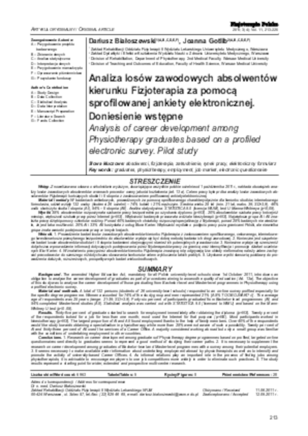 Znowelizowana ustawa o szkolnictwie wyższym, obowiązująca wszystkie polskie uczelnie od 1 października 2011 r., nakłada obowiązek analizy losów zawodowych absolwentów w ramach procedur oceny jakości kształcenia (art. 13 a). Celem pracy była próba analizy losów zawodowych absolwentów Fizjoterapii kończących studia I i II stopnia z zastosowaniem profilowanej ankiety elektronicznej. W badaniach ankietowych, prowadzonych za pomocą sprofilowanego charakterystycznie dla kierunku studiów, internetowego formularza, udział wzięły 132 osoby (studenci 26 uczelni) – 74% kobiet i 21% mężczyzn. Średnia wieku 25 lat (min. 21 lat, maks. 39; SD=3,9). 46% osób ukończyło studia I stopnia (AI), 54% – II stopnia (AII). Analiza statystyczna: STATISTICA 9.0 (licencja WUM), test U Manna-Whitneya (p<0,05).35% absolwentów rozpoczynała szukanie pracy bezpośrednio po uzyskaniu dyplomu (p=NS). 20% absolwentów szukała pracy krócej niż miesiąc, większość szukała pracy przez Internet (p=NS). Większość badanych pracowała w dziale kinezyterapii (p=NS). Największa grupa AI i AII znalazła pracę dzięki pomocy członków rodziny. Ponad 40% badanych chciałoby rozpocząć specjalizację z fizjoterapii, ponad 25% badanych nie wiedziała, że jest taka możliwość. 20% AI i 33% AII korzystała z usług Biura Karier. Większość myślała o podjęciu pracy poza granicami Polski, ale niewielka grupa znała warunki podejmowania pracy w innych krajach. 1. Prowadzenie badań losów zawodowych absolwentów kierunku Fizjoterapia z zastosowaniem sprofilowanego, celowanego, internetowego kwestionariusza przesyłanego bezpośrednio do absolwentów wydaje się być dobrą metodą badania ich drogi zawodowej. 2. Konieczne jest uzupełnienie badań losów absolwentów studiów I i II stopnia badaniami obejmującymi również ich potencjalnych pracodawców. 3. Konieczne wydaje się szersze niż dotychczas wprowadzenie informacji dotyczących podejmowania przez fizjoterapeutów pracy za granicą oraz intensyfikacja i promocja działań uczelnianych Biur Karier. 4. W znalezieniu pracy przez absolwentów kierunku Fizjoterapia znaczącą rolę odgrywają tzw. układy nieformalne, należy zatem zachęcać pracodawców do szerszego niż dotychczas stosowania konkursów celem wykluczenia takich praktyk. 5. Uzyskane wyniki stanowią podstawę do prowadzenia dalszych, rozszerzonych, prospektywnych badań wieloośrodkowych.