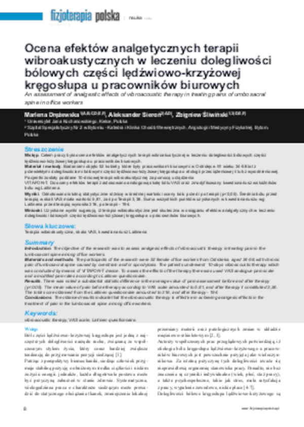 M. Drężewska, A. Sieroń, Z. Śliwiński – Ocena efektów analgetycznych terapii wibroakustycznych w leczeniu dolegliwości bólowych części lędźwiowo-krzyżowej kręgosłupa u pracowników biurowych. FP 2013; 13(3); 8-13