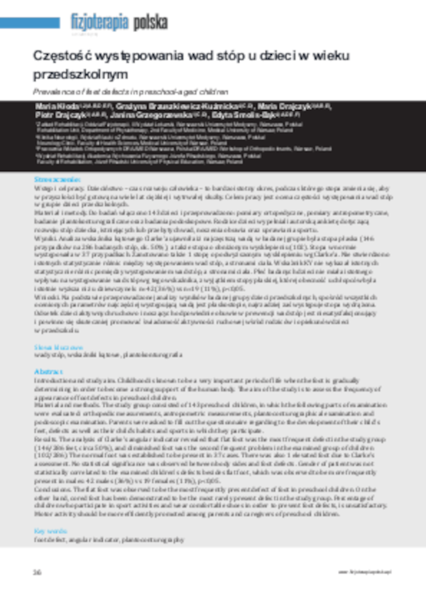 M. Kłoda, G. Brzuszkiewicz-Kuźmicka, M. Drajczyk, P. Drajczyk, J. Grzegorzewska, E. Smolis-Bąk – Prevalence of feet defects in preschool-aged children. FP 2016; 16(1); 36-46