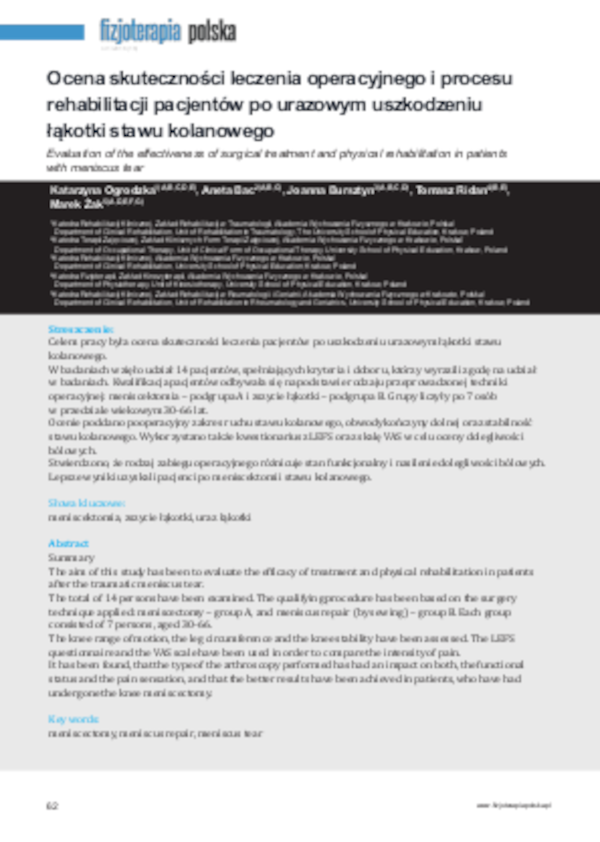K. Ogrodzka, A. Bac, J. Bursztyn, T. Ridan, M. Żak – Evaluation of the effectiveness of surgical treatment and physical rehabilitation in patients with meniscus tear. FP 2016; 16(1); 62-72