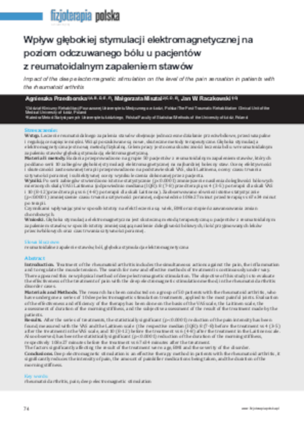 A. Przedborska, Ma. Misztal, J. W. Raczkowski – Impact of the deep electromagnetic stimulation on the level of the pain sensation in patients with the rheumatoid arthritis. FP 2016; 16(1); 74-81