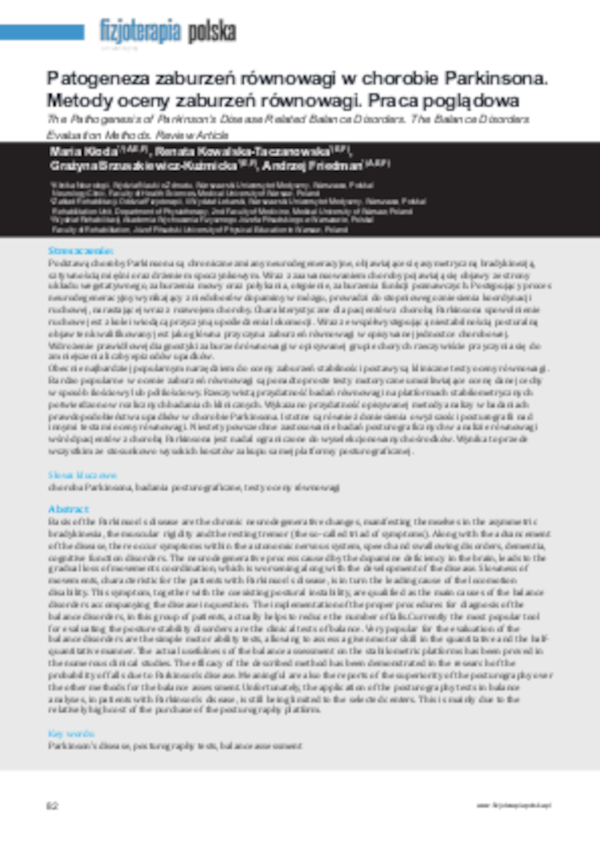 16-1-082 Patogeneza zaburzeń równowagi w chorobie Parkinsona. Metody oceny zaburzeń równowagi. Praca poglądowa - M. Kłoda et al