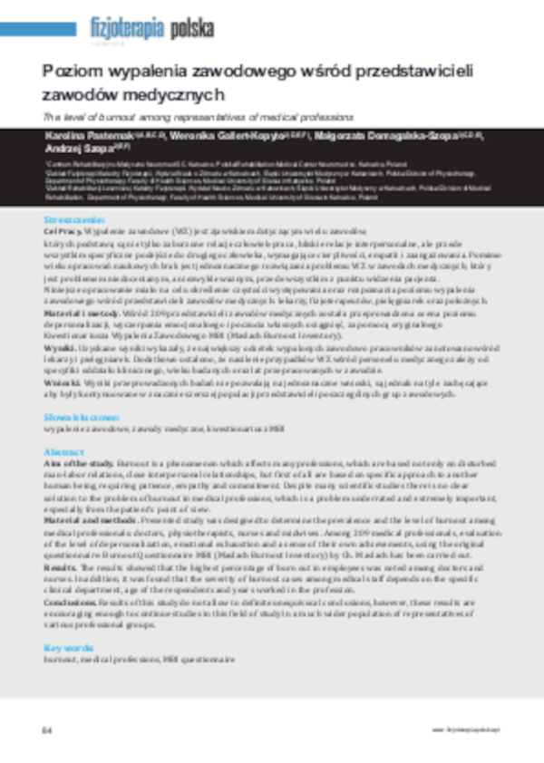 K. Pasternak, W. Gallert-Kopyto, M. Domagalska-Szopa, A. Szopa – The level of burnout among representatives of medical professions. FP 2016; 16(2); 84-90