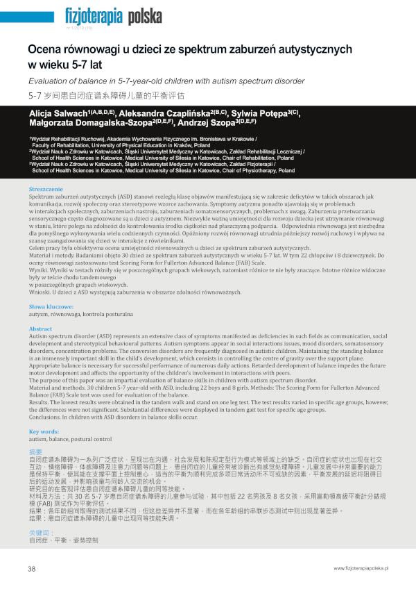 A. Salwach, A. Czaplińska, S. Potępa, M. Domagalska-Szopa, A. Szopa – Evaluation of balance in 5-7-year-old children with autism spectrum disorder. Fizjoterapia Polska 2019; 19(1); 38-44