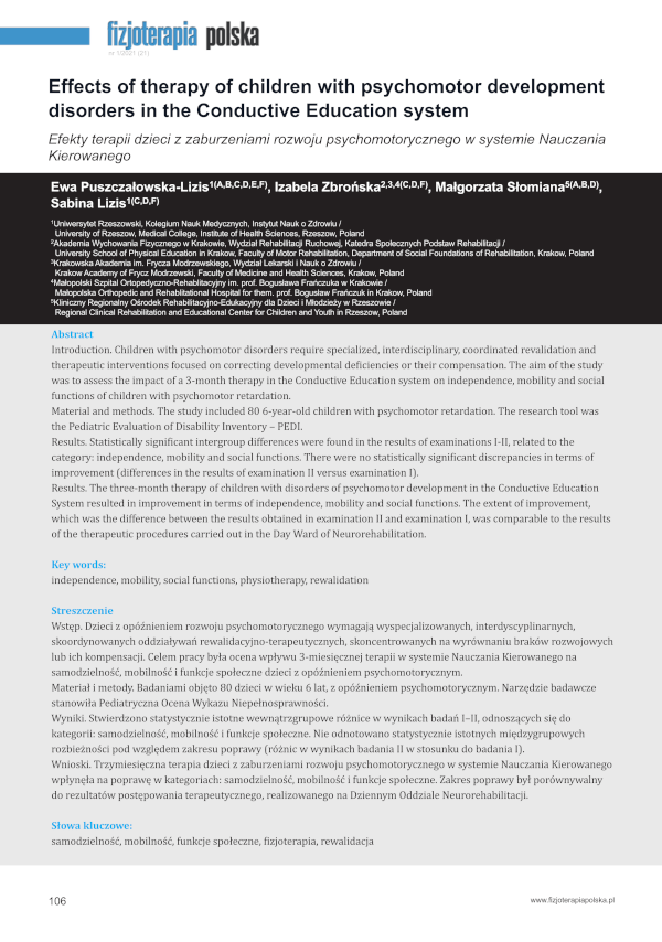Ewa Puszczałowska-Lizis, Izabela Zbrońska, Małgorzata Słomiana, Sabina Lizis – Effects of therapy of children with psychomotor development disorders in the Conductive Education system. Fizjoterapia Polska 2021; 21(1); 106-111