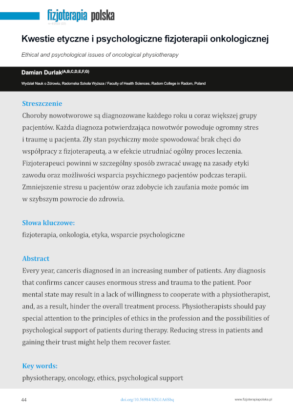 Damian Durlak – Kwestie etyczne i psychologiczne fizjoterapii onkologicznej. Fizjoterapia Polska 2022; 22(4); 44-46